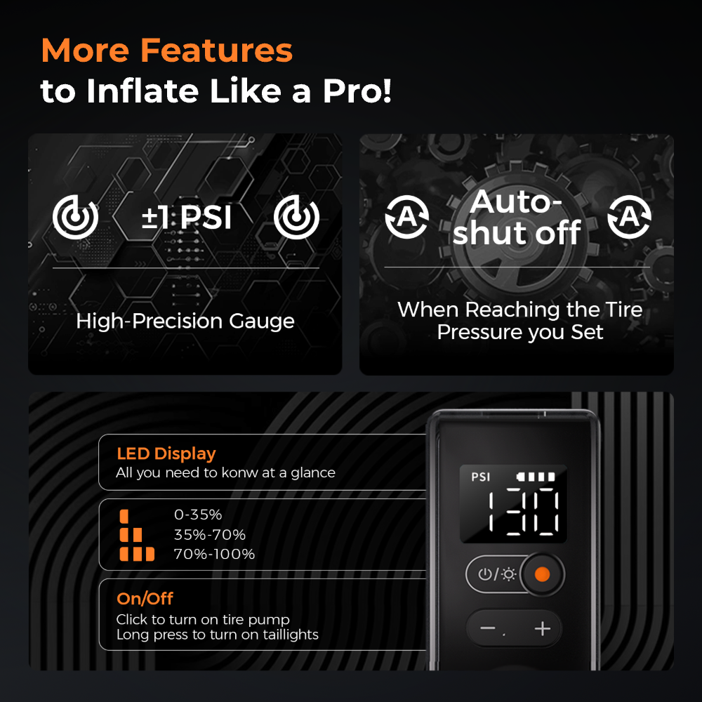 With the product's LED digital display screen and many thoughtful features, you can control tire pressure more accurately and enjoy a more professional and easier inflation experience.
