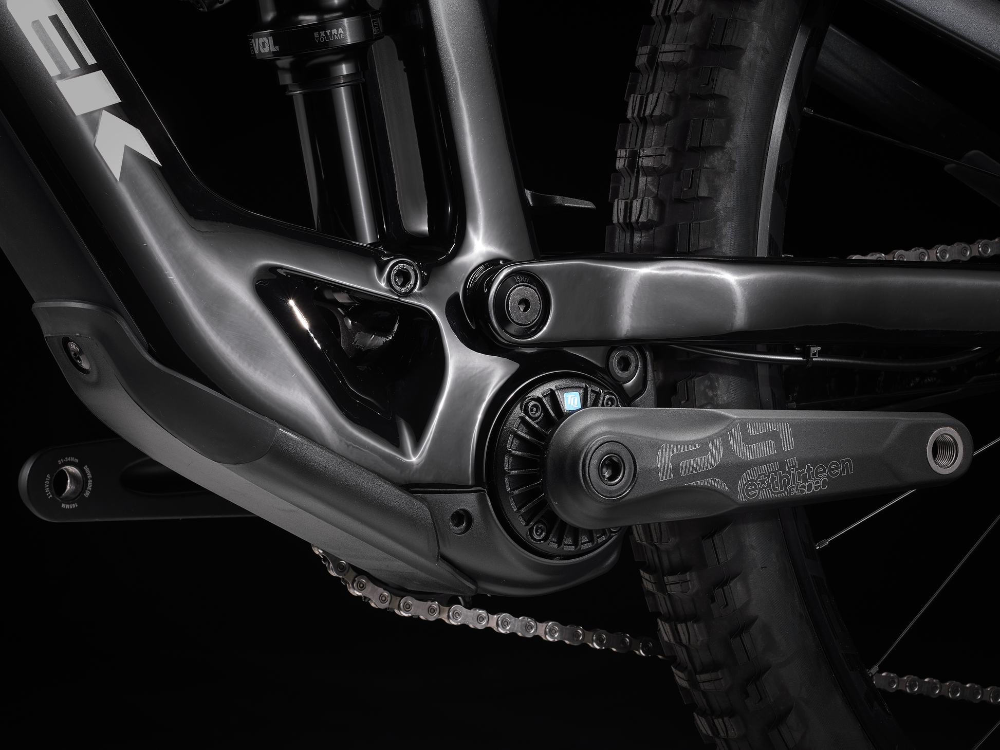 An OCLV Mountain Carbon frame equipped with a fully encased 360 Wh battery and TQ harmonic pin ring transmission with a smart charging port, integrated LED display and discreet handlebar remote. 150 mm FOX Rhythm 36 fork with Float EVOL air spring and GRIP damper, and 140 mm FOX Performance Float X rear suspension. Plus tubeless-ready wheels and tyres, and a 12-speed drivetrain of cherry-picked Shimano SLX and XT components.