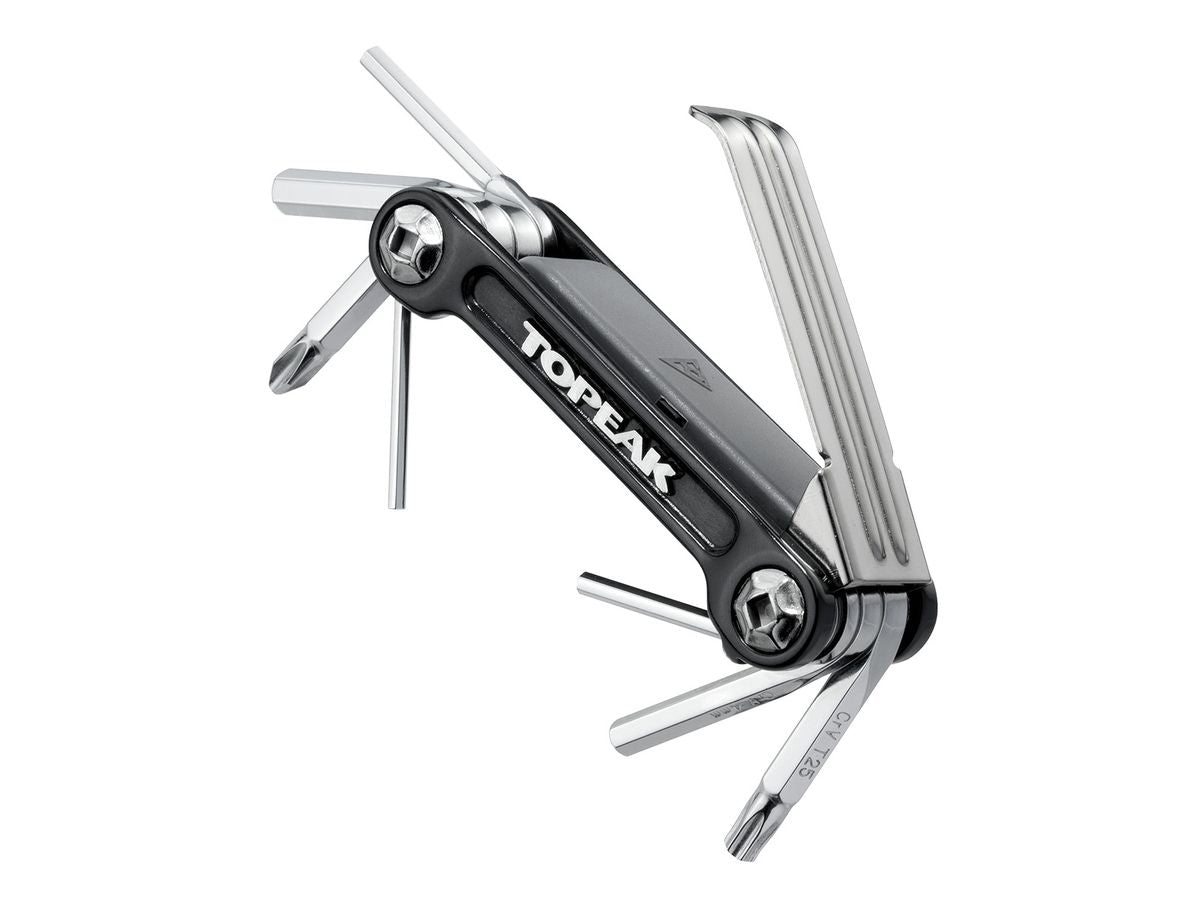 9 function pro quality tool folds in a sleek forged alloy body. An additional removable folding tire lever stores inside the tool body for a streamlined profile. Perfect for long road rides or endurance mountain biking. Includes a neoprene bag.