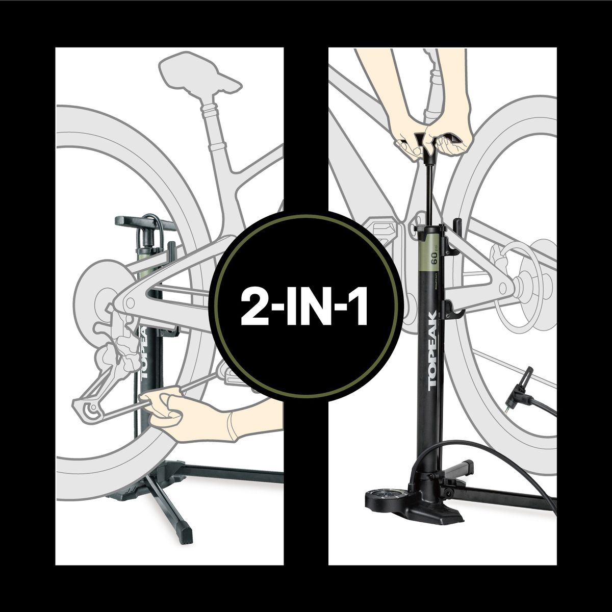 The JoeBlow Mountain EX features an integrated stand that combines the functionality of a pump with a home display and maintenance tool. The hook on the stand is equipped with rubber padding to prevent any damage to your bike frame. With a weight capacity of 30kg and a high volume capacity, it is particularly suitable for mountain bikes.